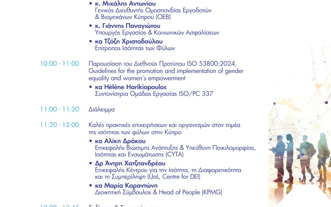 O Κυπριακός Οργανισμός Τυποποίησης (CYS) και η Ομοσπονδία Εργοδοτών και Βιομηχάνων (ΟΕΒ), σας προσκαλούν στην ανοικτή Ενημερωτική Ημερίδα: Η συμβολή της Τυποποίησης στην Ισότητα των Φύλων – Το πρώτο Διεθνές Πρότυπο ISO 53800:2024, Guidelines for the promotion and implementation of gender equality and women’s empowerment, η οποία τελεί υπό την αιγίδα της Επιτρόπου Ισότητας των Φύλων, κας Τζόζη Χριστοδούλου.nnΚατά τη διάρκεια της ημερίδας, θα παρουσιαστούν οι κυριότερες πρόνοιες  του διεθνούς προτύπου που εκπόνησε ο Διεθνής Οργανισμός Τυποποίησης (ISO), «ISO 53800:2024 – Guidelines for the promotion and implementation of gender equality and women’s empowerment», το οποίο παρέχει κατευθυντήριες οδηγίες στους οργανισμούς για την προώθηση και εφαρμογή της ισότητας των φύλων και της ενδυνάμωσης των γυναικών. Την εκδήλωση θα χαιρετίσουν ο έντιμος Υπουργός Εργασίας και Κοινωνικών Ασφαλίσεων καθώς και η Επίτροπος Ισότητας των Φύλων. Επιπρόσθετα, θα παρουσιαστούν καλές πρακτικές ισότητας που εφαρμόζονται από κυπριακές επιχειρήσεις και οργανισμούς.nnΗ υιοθέτηση του ISO 53800, προωθεί στην πράξη την πλήρη κατανόηση και εφαρμογή της ισότητας των φύλων, υποστηρίζει τη δημιουργία δίκαιων οργανωτικών κουλτούρων και ενθαρρύνει την ισότητα των φύλων ως θεμελιώδες ζήτημα ανθρωπίνων δικαιωμάτων. Παράλληλα, βοηθά τους οργανισμούς στην εκπλήρωση των νομικών υποχρεώσεων τους σχετικά με την ισότητα των φύλων.nΛεπτομέρειες Hμερίδας: n📅 Ημερομηνία: 11 Οκτωβρίου 2024n⏰ Ώρα: 09:00 – 13:00n📍 Τοποθεσία: Ξενοδοχείο Κλεοπάτρα, Λευκωσίαnn Για περισσότερες πληροφορίες και δήλωση συμμετοχής πατήστε ΕΔΩnnnn